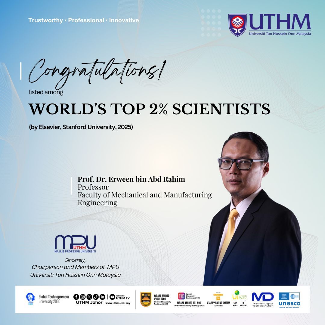 Pensyarah UTHM tersenarai dalam kelompok dua peratus saintis terbaik dunia -