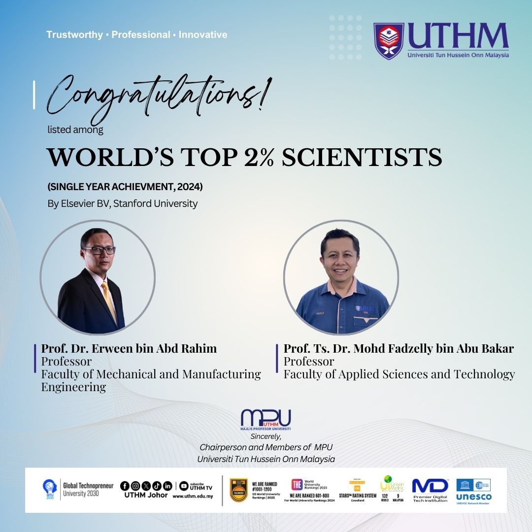 Tiga Pensyarah UTHM Tersenarai Antara 2% Saintis Terbaik Dunia -